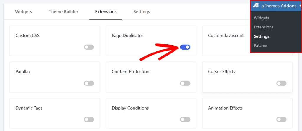 To enable the Page Duplicator extension, go to aThemes Addons > Settings and click on the Extensions tab. From there, click on the toggle button for the Page Duplicator extension.