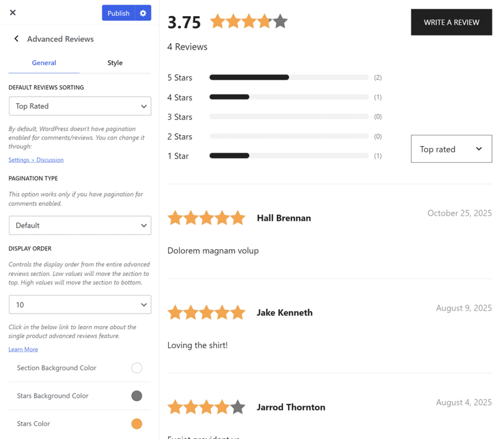 - Section Background Color: Sets the background color for the advanced reviews section.