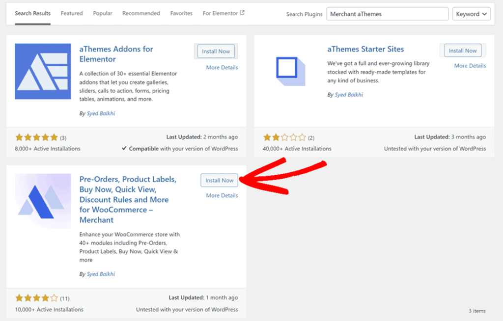 Then, locate Pre-Orders, Product Labels, Buy Now, Quick View, Discount Rules and More for WooCommerce – Merchant in the results and click Install Now.