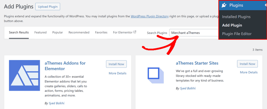 Go to Plugins » Add Plugin, then search for Merchant aThemes.